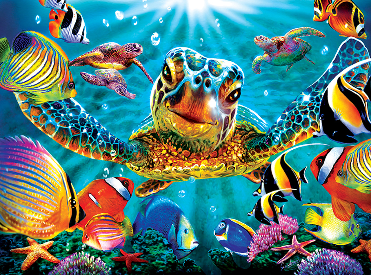 Beautiful. Males ya smile just looking at it. Start with the frame. Then the turtle i think is easiest.. followed by the fish. Some fish are very similar which gives this puzzle a nice challenge